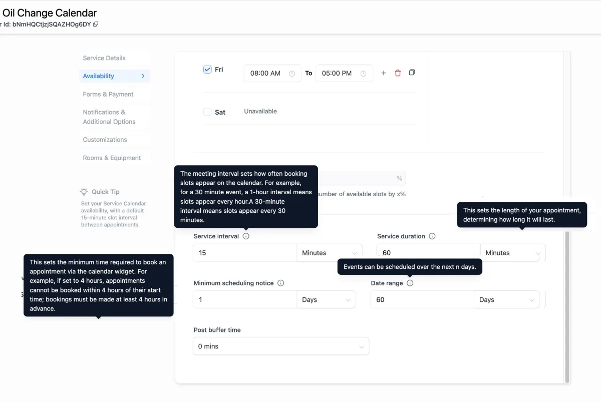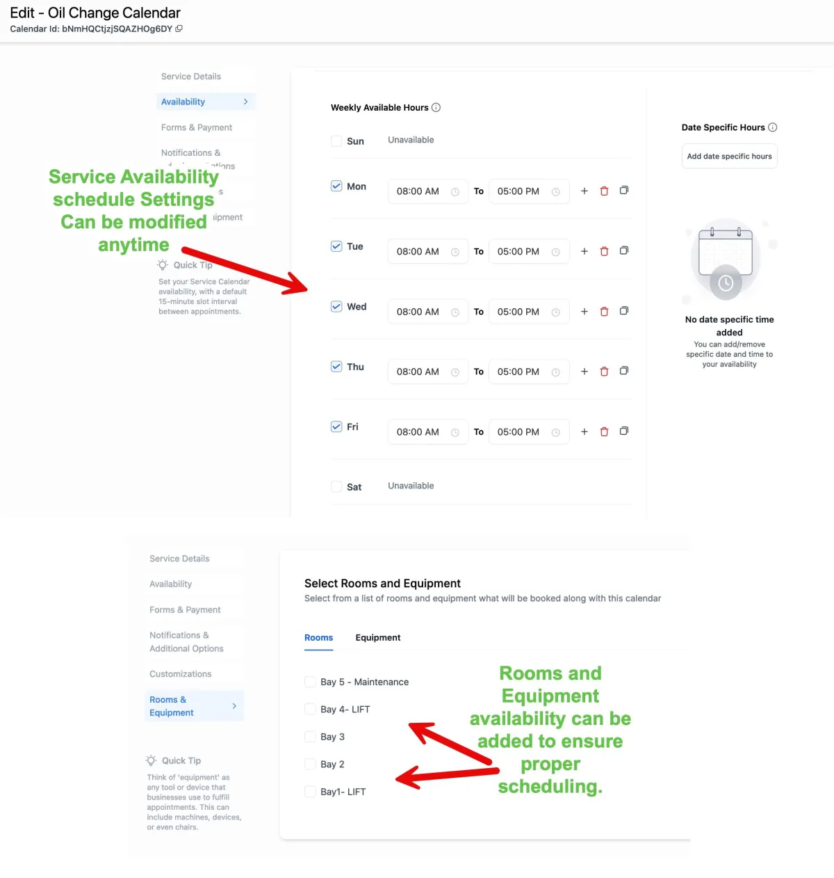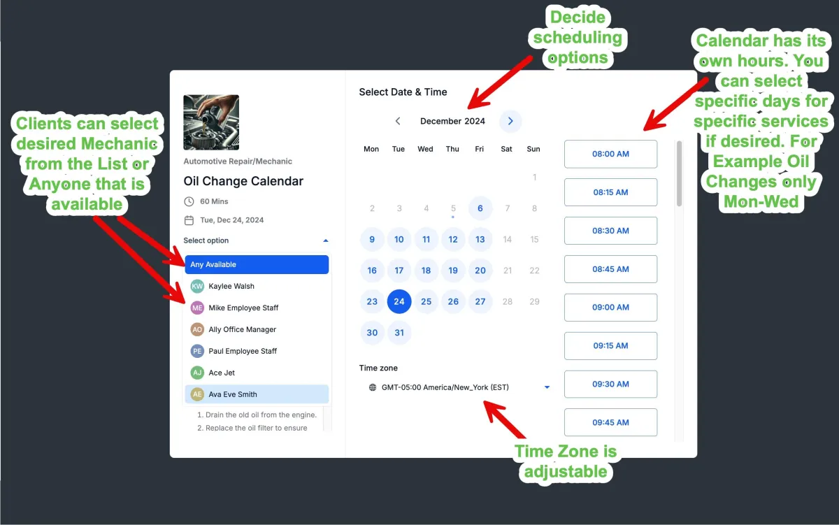 This calendar can be customized according to your needs. See video on how easily this can be customized and modified to fit your business needs. This one allocates 60 Minutes for the Oil Change, Systems checks availability of 3 Mechanics on the backend as well as the lifts to ensure all are available and display available time slots.